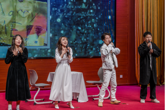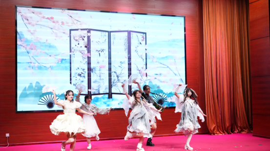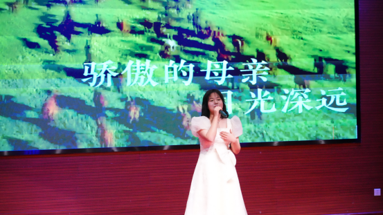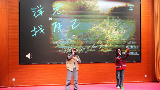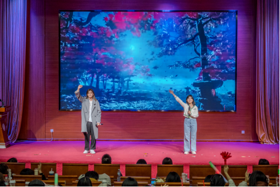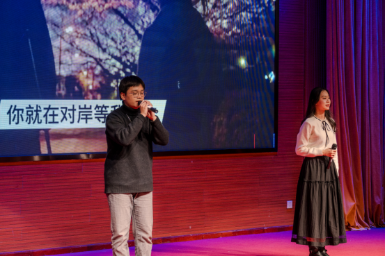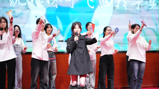第三篇章开篇,23级国贸班郑东玥同学带来朗诵《月光下的中国》,声情并茂,诵出月光下中国的柔美、厚重与千年的诗意柔情。随后,24级金融1班翟耀雯同学一首独唱《乌兰巴托的夜》,如风中残烛般摇曳着无尽的孤独与深沉的思念,令观众也仿若置身于那片广袤无垠、星子低垂的草原夜空下。24级金融2班陈煜雯等同学带来舞蹈《寄明月》,将传统与现代完美融合,举手投足间尽显古韵新风,洒下一片清辉绮梦。最后,由24级经济班带来的配音合唱串烧《听!是前世“经声”》,声效逼真,各种经典台词情境重现,《稻香》一曲响起,又似回至童年那片无忧的田野,交织成一场震撼视听的盛宴。