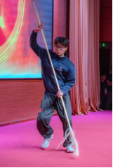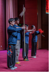 本次联欢会以“百花齐放”为序章,引出“同心逐梦”“破浪前行”和“齐筑未来”三个篇章。联欢会伊始,校武术队带来武术表演《武动乾坤》,诸般武艺齐登场,似百花盛放,耀目华光,为晚会铺垫了热烈的基调。