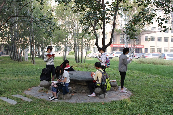 本次晨读活动在借鉴了往年经验的基础上又有所创新,共分为了三个环节:自由朗读,单独背诵和集体背诵。早晨7点15分,在我院老生们的组织带领下,同学们准时到达来园、凌霜园等晨读场地,迫不及待地拿出英语精读课本开始朗读。期间,大家时而高声朗读,时而默默背诵,时而同他人讨论发音,时而与学长学姐交流学英语的方法。在这秋日的晨光下,在这充溢着蓬勃朝气的校园里,同学们个个精神饱满,专心致志,全情投入到晨读活动中。最后,在整齐而嘹亮的集体诵读中,新生们结束了第一天的晨读活动。