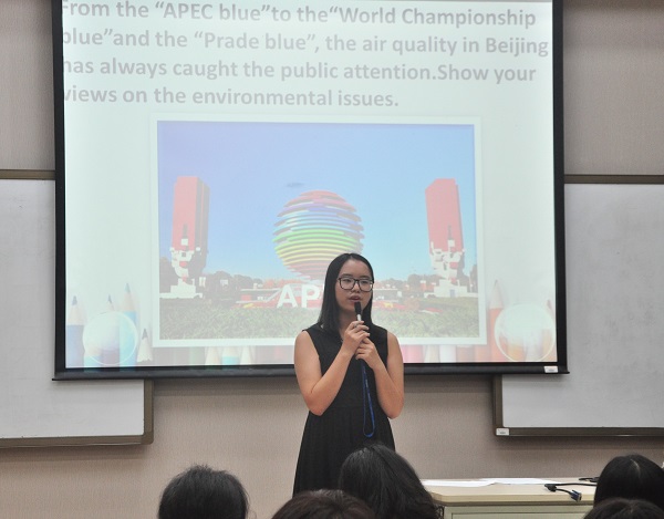 本次比赛共有两个环节。第一个环节是定题演讲,选手们以 “China’s V-Day Military Parade”为主题展开叙述,从历史、军事、政治、经济等多个角度阐述了大阅兵的意义和精神。他们凭借精湛的英语口语水平和落落大方的仪态打动着每一位观众。在淘汰赛制下,第一轮排名前八的选手入围了第二环节--即兴演讲。在本环节,选手要根据PPT上展示的图片进行1分30秒的即兴演讲。即兴演讲的图片涵盖了电梯事故、APEC蓝、北京申奥和电影《大圣归来》等年度热点话题,内容丰富,贴近生活,选手们思维敏捷,表达流畅,展示出了深厚的英语功底。他们精彩机智的演讲给观众们留下深刻的印象,现场反响热烈。