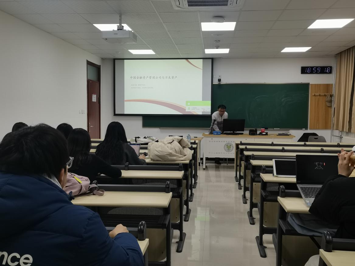 李鹏老师首先向同学们介绍了金融不良资产市场主体、金融资产管理公司成立背景与功能定位、金融资产管理公司发展的历程与成就,并以中国信达为例讲述了金融资产管理公司与不良资产发展历程,详细阐述了中国信达的公司宗旨、主营范围、发展理念与组织框架。紧接着,李老师说明了金融资产管理公司主要业务模式,分别介绍了业务板块构成、债权资产、股权资产和并购重组。其中,李老师详细介绍了传统不良资产业务,包括不良资产的处置模式、不良资产的估值等。接下来,李鹏老师从房地产风险化解、地方中小银行改革化解、地方政府债务化解三方面,阐述了金融资产管理公司如何参与社会经济关注热点。最后,李老师向同学们讲述了金融资产管理公司在危机救助、上市公司业务、破产重组三方面的案例。