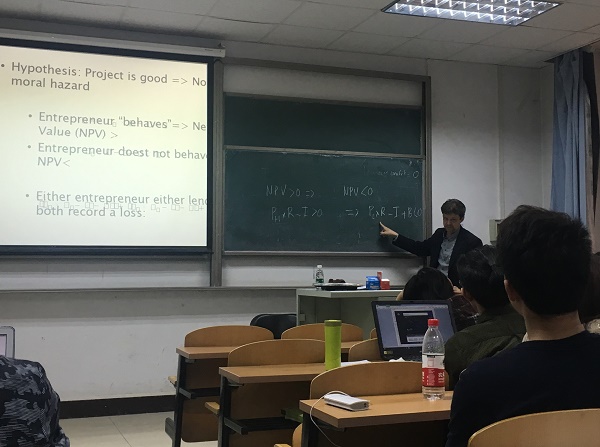 在讲座正式开始前,教授分别用法语和英语进行了自我介绍,同学们积极回应,现场气氛热烈。随后,Laurent AUGIER教授分别解释了Financial Incentive Theory 和 Agency Costs两个理论,为同学们生动地剖析了两个理论的原理和实际运用。在讲到财务激励机制时,AUGIER教授与同学们进行了精彩的互动。同学们主动与教授交流所学的相关知识和遇到的难题,AUGIER教授一一表示肯定并释疑。最后,Laurent AUGIER教授还结合了当前形势,对企业融资及代理的发展情况进行了全面阐释,并鼓励同学们探寻规律,不断求知。讲座在同学们热烈的掌声中结束。