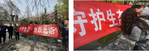 活动最后,大家在物业服务中心准备的“守护生态·鱼跃北语”的横幅上签名,对践行环保理念许下承诺。