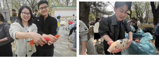 随后,大家自觉排队,有序地进行放鱼。在师傅们的悉心指导下,大家小心翼翼地将鱼儿放入水中,一条条鱼儿欢快地游向水中,泛起了层层涟漪,吸引众多师生驻足赏鱼。看着鱼苗们在水中自由自在地游动,大家的脸上露出了欣慰的笑容。一位参与活动的学生党员表示:“这次放鱼活动不仅让我们感受到了生命的悦动,也让我们更加深刻地认识到保护生态环境的重要性。希望之后我们也能像鱼苗一样,在群众中激活‘红色细胞’,带动更多人参与环保。”