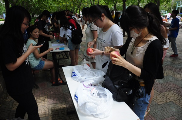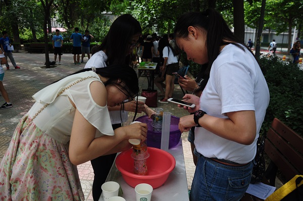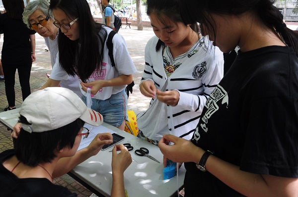 中午开始,工作人员就在篮球场林荫处布置好了场地,等待同学们的到来。参赛队员们陆续前来,自行到所报项目组开始比赛。比赛分为六个项目,削苹果、滴水不漏、颠球大赛、夹花生、双摇跳绳和穿针引线,每项时长1分钟。这六个项目在工作人员的引导下同时进行,有条不紊。同学们各尽所能,应对规则招式多样,个个兴致高昂。更有留学生、足球队队员参与体验,欢声笑语不断从篮球场传出,现场其乐融融。比赛一直持续到下午两点半结束。