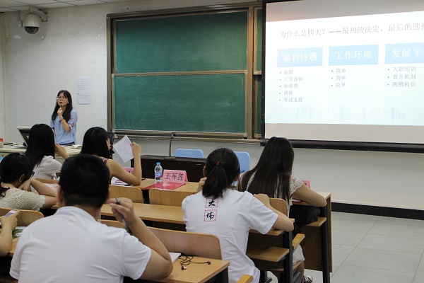 本次经验交流会共分为就业、留学、考研三个部分。在就业部分,杨雨馨(招商银行)、赵越(德勤)、王军莲(华润置地)分别就银行、外企、国企应聘和工作经历同大家做了细致的分享,从应聘到工作体验,为同学们展现了不同就业领域的特点。