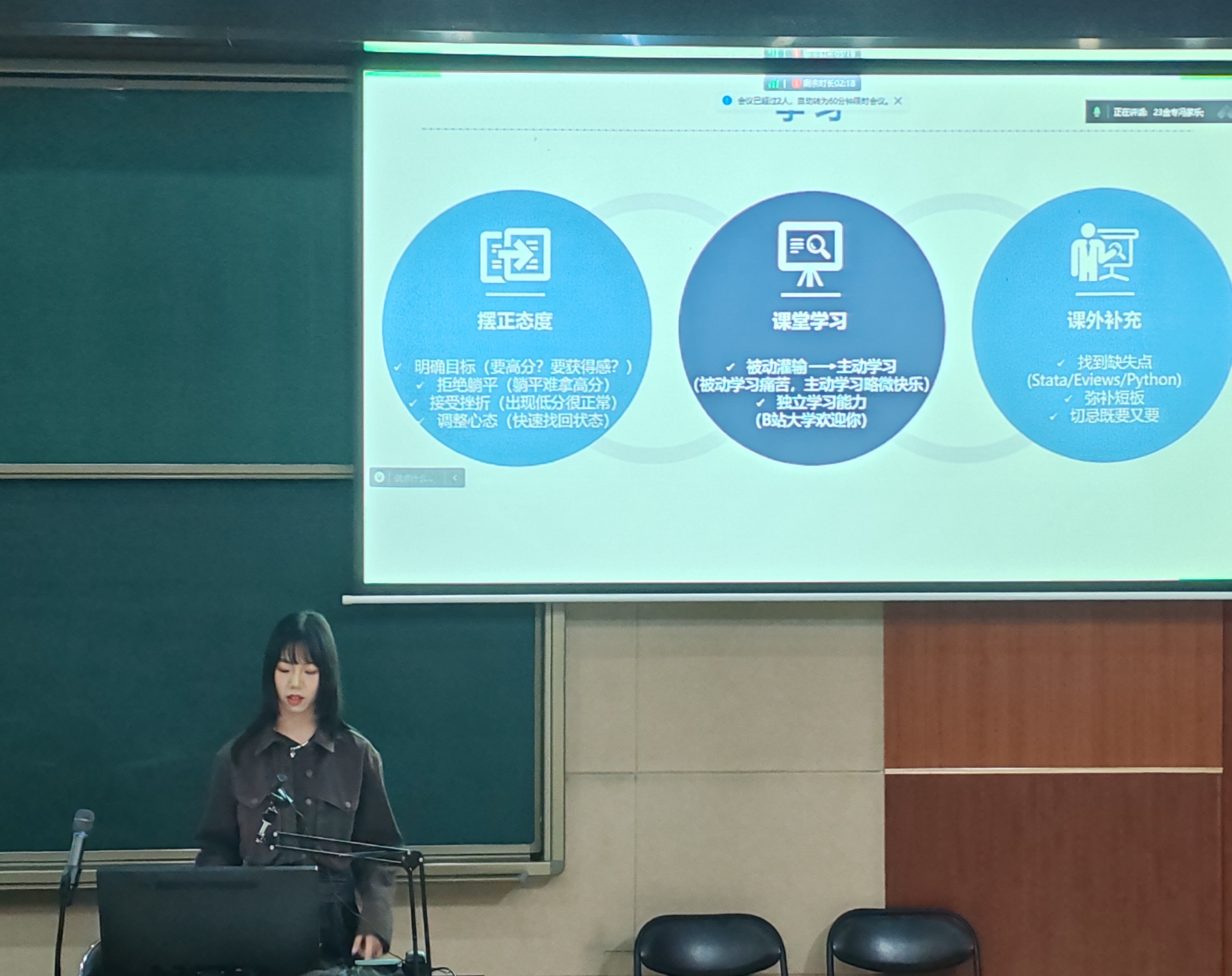 为加强新生教育,帮助同学们更加合理地规划研究生生活,实现身份角色的顺利转换,我院于11月2日晚在主南102教室成功举办“明途知往,朋辈引航”研究生经验分享会。此次活动邀请到22级会计专硕李馨悦、瞿小语,22级金融专硕王婉濛、王玺存四位主讲人从课程学习、科研参与、时间规划和实习等方面的经验进行分享。