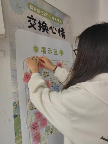 为引导同学们告别焦虑,释放情绪,增强大家的心理素质和自助能力,更好地把握生活节奏,5月25日下午,商学院在学生宿舍15楼东侧举办了“5.25心理文化日——交换心情”活动。