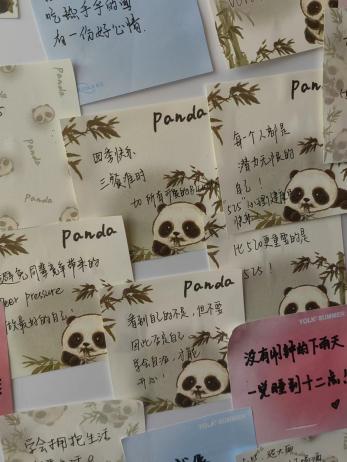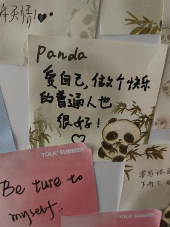 微雨过,同学们陆续来到活动现场。参与者可以选择自己喜欢的便签纸,在纸上写下感受或愿望,不论是对未来的期许还是日常生活的温馨瞬间,同学们落下的每一笔,都是美好记忆的定格。大家将自己的心情便利贴放在易拉宝上,作为交换,可以得到解压的捏捏乐礼品,完成“交换心情”的过程。便利贴成为传递正能量的媒介,大家在活动中不仅表达了自己的感受、释放了情绪,也从他人的心情便利贴中获得能量和温暖。