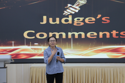 揭晓名次之前,刘北博士对整场比赛进行全面而精彩的点评。刘老师分享了与商学院新生英语口语大赛共同走过的时光和一路同行的感动,对全体参赛选手的表现给予充分认可,并对选手们的演讲内容与现场发挥进行点评。刘老师肯定了同学们在面对同一主题时,能够从个人经历、学科知识、社会观察等不同维度展开思辨,让表达既有温度又有深度;鼓励同学们在真听、真讲、真思、真练中提高语言综合能力,珍惜锤炼自我、展示风采的宝贵舞台,在比赛中不断汲取经验、获得新知、成长进步。