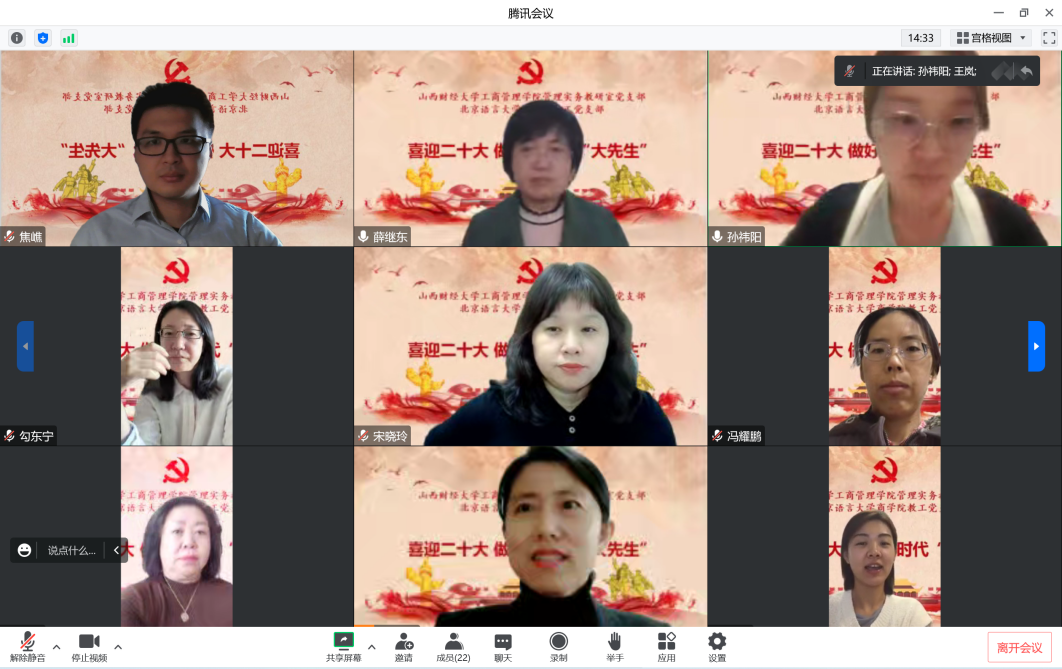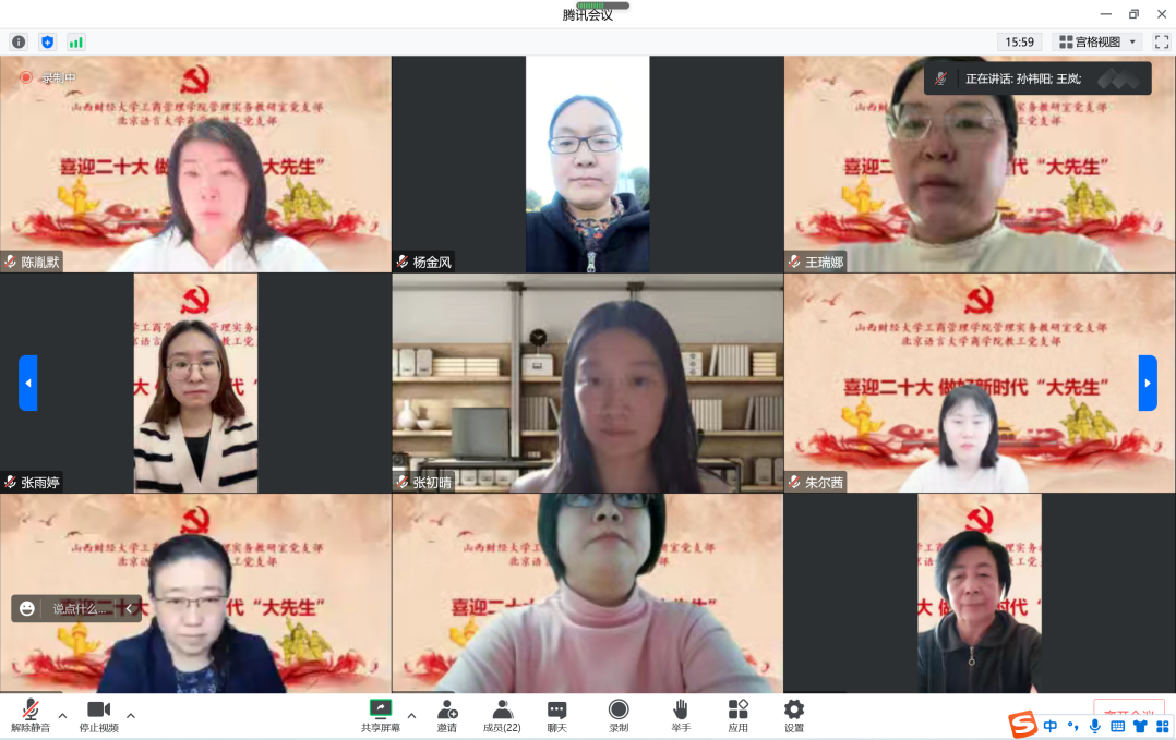 为深入学习贯彻习近平总书记有关师风师德和教书育人的重要论述,切实担负起为党育人、为国育才的使命,学习全国党建样板支部山西财经大学工商管理学院管理实务教研室党支部的优秀做法,进一步强化高校教师党支部党建与中心工作深度融合,切实把党建优势转化为事业发展优势。10月11日下午,我院教工党支部与山西财经大学工商管理实务教研室党支部共同开展“喜迎二十大 做好新时代‘大先生’”主题党日活动。双方支部党员近30人线上参加活动,活动由商学院教工党支部书记王岚主持。