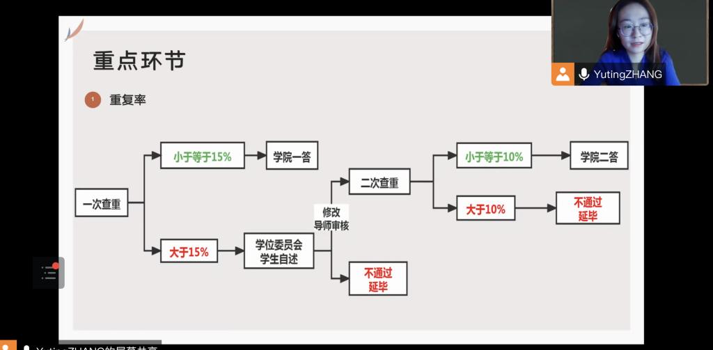 本科教务秘书张雨婷老师围绕教务处本科毕业环节相关要求,就学分安排、时间节点、通知发布、论文系统以及文件格式等论文管理层面的重要流程进行介绍,着重强调学术道德、论文查重规定以及学校抽检流程。根据往届毕业生的特殊情况,对于题目修改流程、开题与答辩报告会请假手续和实习相关文件进行说明。