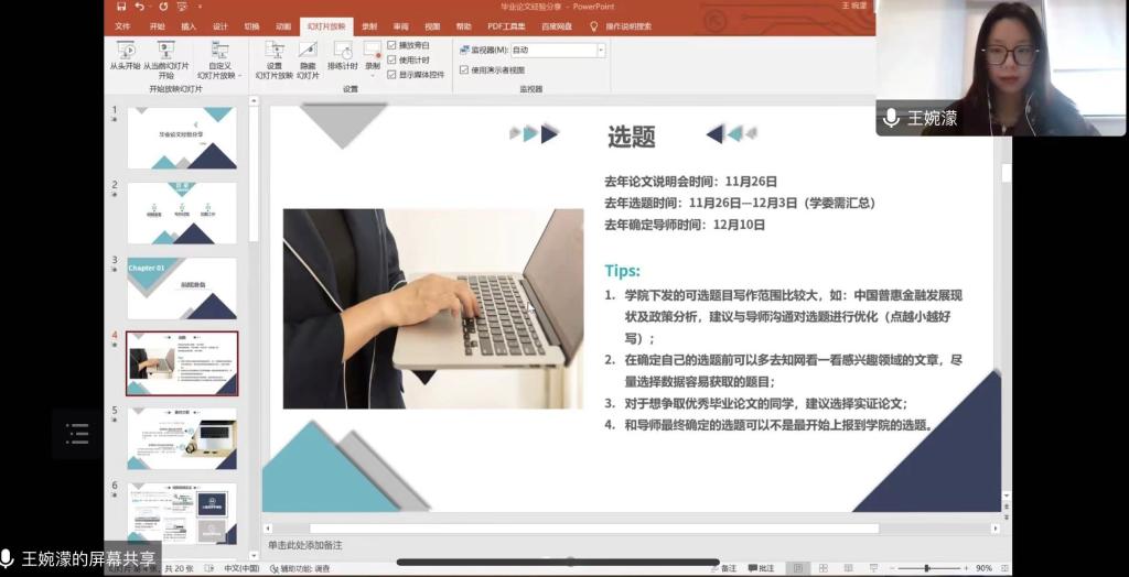 22届金融专业王婉濛从本科学位论文前期准备、写作过程与后期工作三方面进行经验交流。从实操层面详细说明,以个人写作过程为一手经验,分享如找数据做实证、论文查重、格式调整等实用性技能贴士。