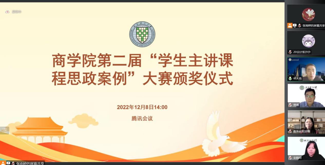 为深入贯彻落实党的二十大会议精神与习近平总书记关于教育的重要论述,培养学生做社会主义核心价值观的坚定信仰者、积极传播者、模范践行者;深化学校2022教育质量年,展示学院各专业“三进”与“课程思政”的建设成果,我院于2022年11月-12月组织了第二届“学生主讲课程思政案例”大赛,并于12月9日下午举行大赛颁奖仪式。商学院院长宋晓玲、教务处副处长刘宝霞、马克思主义学院副院长贾甫出席,8组决赛队伍共23名同学参加了活动。仪式由商学院副院长祁大伟主持。