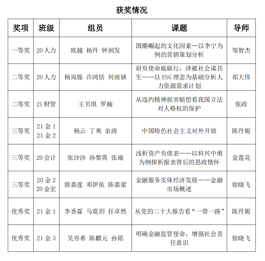 大赛以“向前看”、“回头望”为参赛主题,要求参赛者优先选取马工程教材对应的专业课知识点,结合思政元素与时事热点,自定题目自由组队,所选专业课任课教师为指导老师,面向20级与21级全体同学,最终共有25组同学报名,内容涉及“国潮李宁”、“科兴中维”、“长安汽车”、“一带一路”、“金融监管”、“精准扶贫”等诸多时下热门话题;初赛采取提交教案进行匿名评审的形式,选取8组进入决赛环节;根据疫情防控政策,决赛调整赛制后由各组提交录制的说课视频,评选出一等奖1名,二等奖2名,三等奖3名,优秀奖2名。