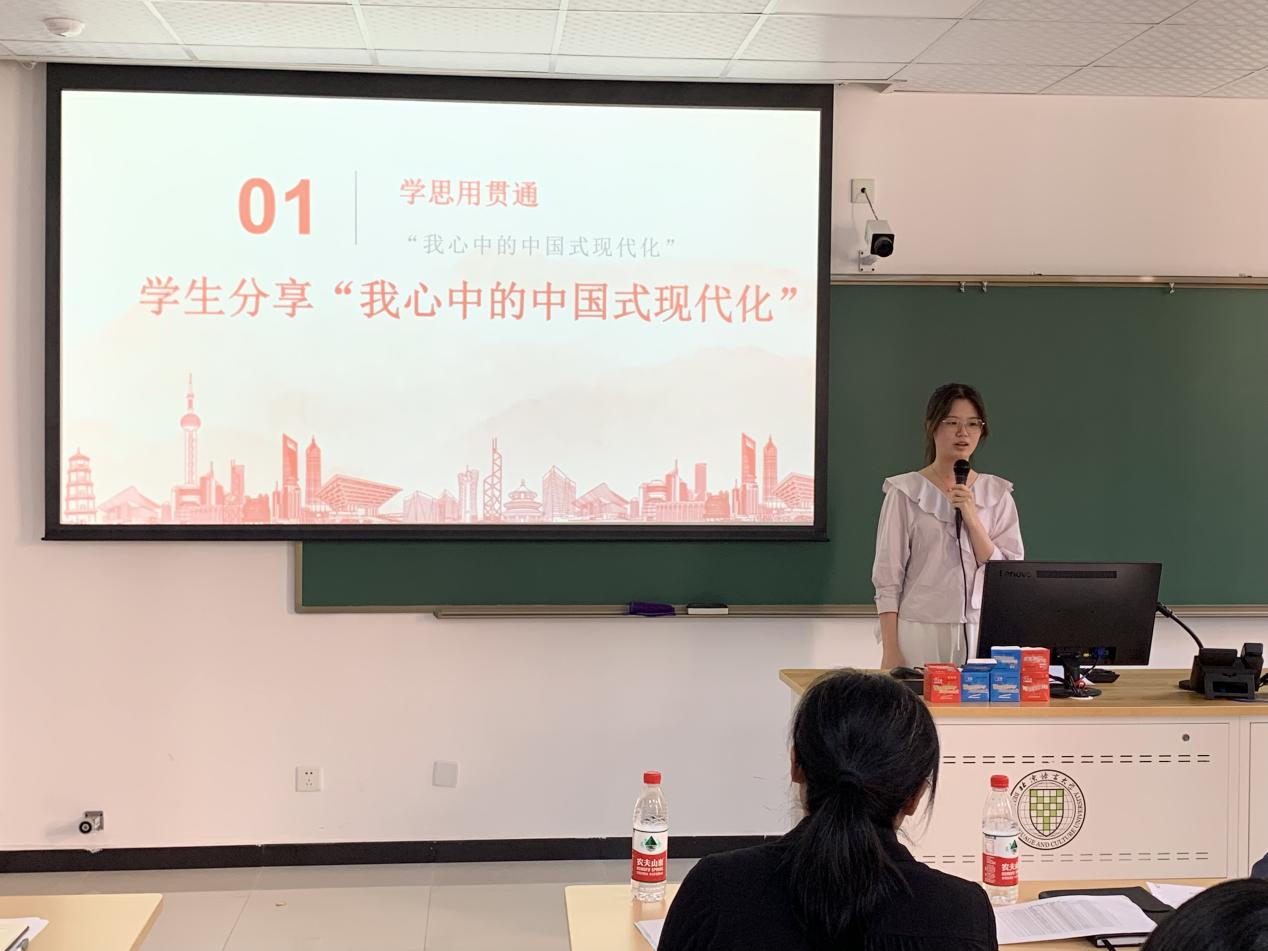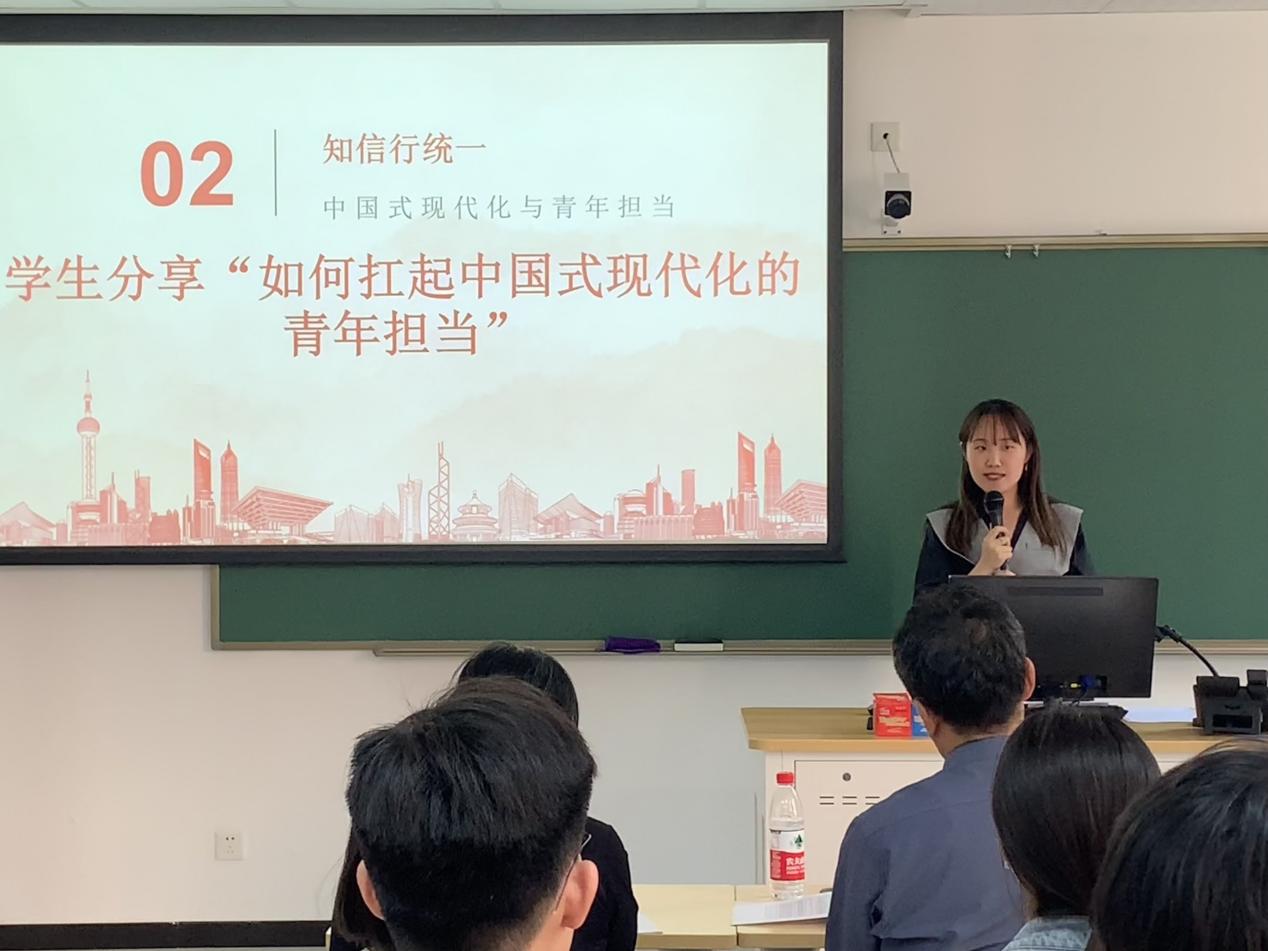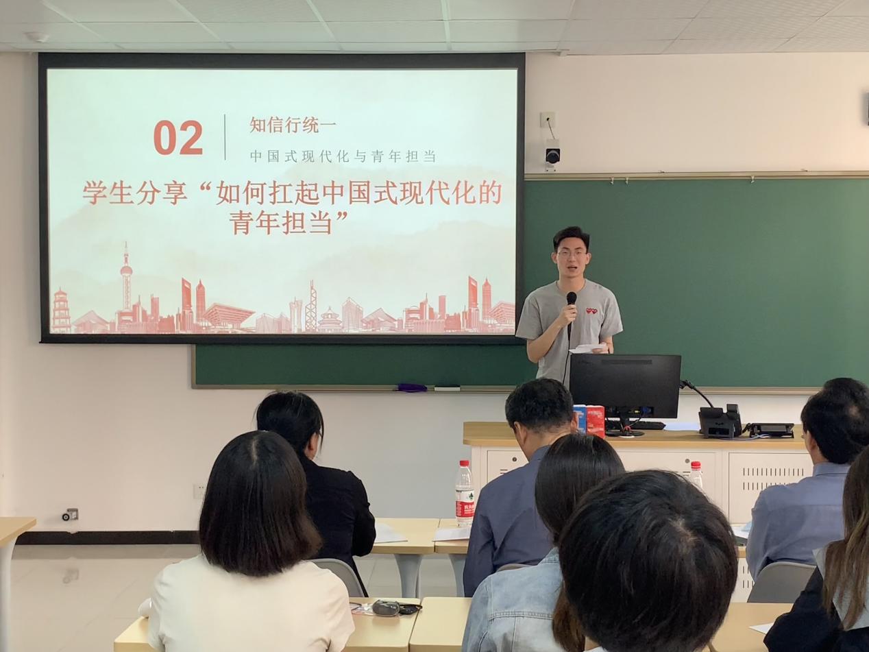 班团活动上,王艺豪、张弛晨等7位同学围绕“学思用贯通”环节分别从乡村振兴、改革开放、科技创新等方面谈了自己对中国式现代化的理解和感受。在“知信行统一”环节,蔡都都、徐智健等4位同学结合自身经历分享了青年如何扛起中国式现代化责任的认识。蔡都都同学强调作为青年应该提高自身综合素质,提升眼界,夯实能力。张奕同学讲述了自己参加“挑战杯”的实践经历,激励同学们要有担当、敢担当。徐智健同学表示作为学生党员,将在推进中国式现代化的道路上作出青年表率,贡献青春力量。刘富潇同学通过分享志愿服务经历和感受,鼓励同学们要奉献爱心,丰富自己的精神世界。
