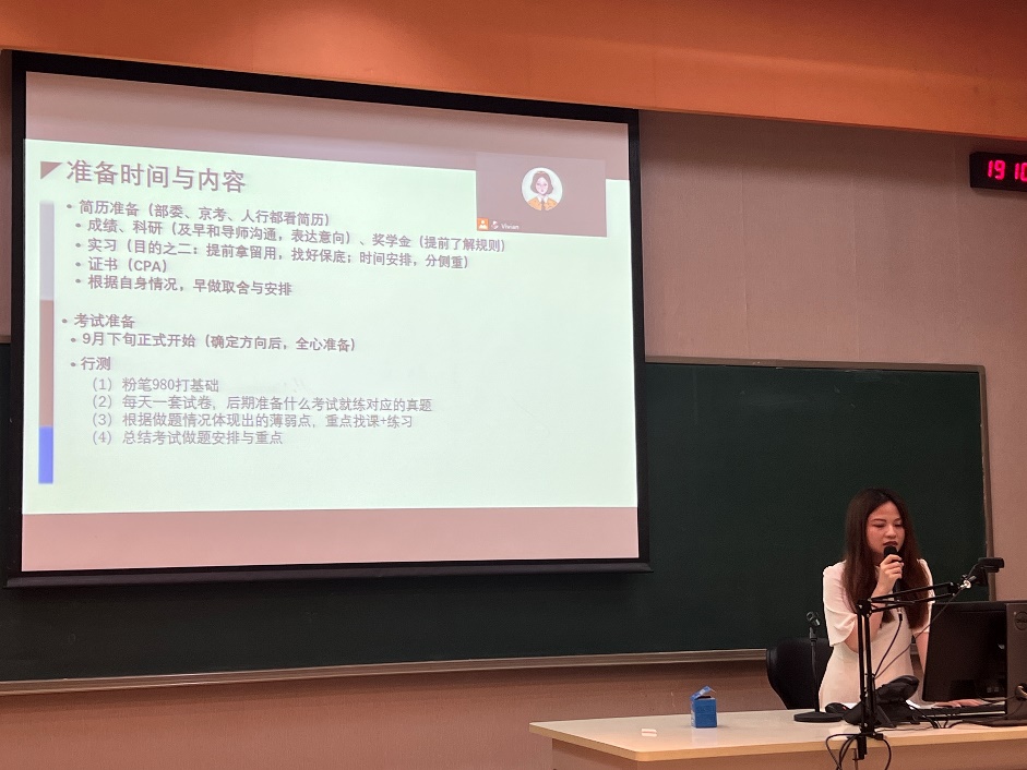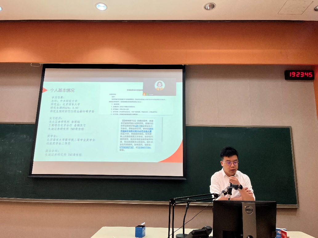 5月24日晚,“青年就业记” 商学院研究生毕业生经验交流会(金融专场)在主南201顺利举行。四位2023届研究生毕业生分享了自己实习和就业的宝贵经验,解答了同学们的相关问题,并且给出中肯的建议。