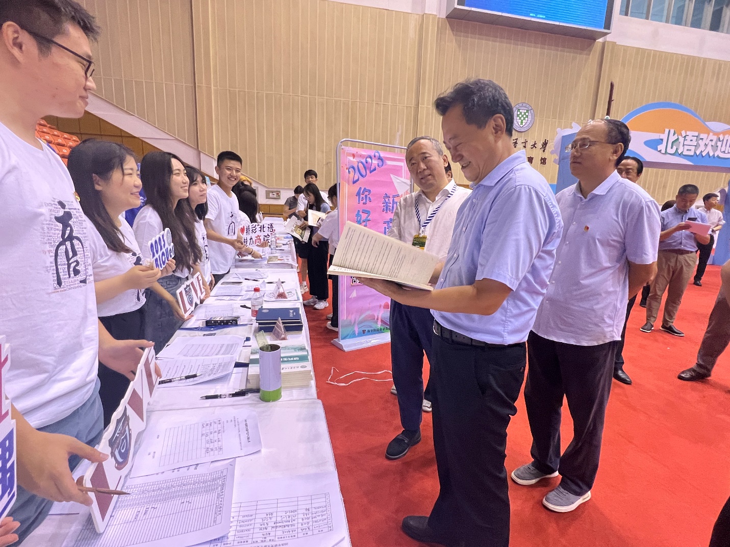 卷云收夏暑,新雨带秋岚。9月8日,商学院2023级本研新生迎新工作在逸夫体育馆顺利开展。校党委书记倪海东、校长段鹏等校领导莅临新生报到现场,走访我院,了解迎新工作的开展情况,并对工作人员进行亲切慰问。