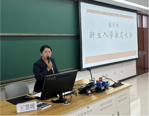 在本科生新生入学教育会上,学院党委副书记王慧媛老师介绍学院概况及分工情况,并从学风建设、日常管理、党团班建设、大学生活适应等多个方面对新生进行教育引导,重点提醒新生要树立安全意识,注意人身安全及财产安全,警惕电信网络诈骗。王老师希望同学们要尽快转变角色,熟悉新的环境,以积极的心态和良好的面貌适应接下来的大学校园生活;努力学习专业知识,打好基础,制定目标,做好未来规划。学办负责人刘珊老师对奖助学金、资助、交换生等工作进行说明,鼓励同学们在大学期间积极探索,大胆尝试,不断提升自我,充实自我。新生辅导员辛茹雯老师介绍新生工作安排及要求,希望同学们做好自我管理,承担和安排好生活、学习,在学习和生活中培养独立解决问题的能力。