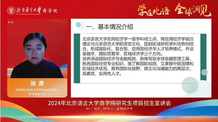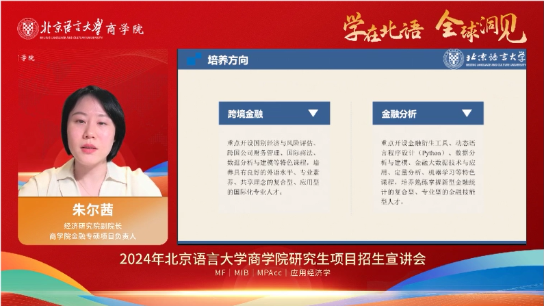会议伊始,主持人北京语言大学商学院学办负责人刘珊老师对北京语言大学和北语商学院的整体情况和办学特色作了简要介绍。随后,北语经济研究院副院长、商学院金融专硕项目负责人朱尔茜教授对金融专硕项目作了详细介绍,包含培养方向、师资力量、奖助体系、实习实训、就业情况和自命题科目等相关信息,内容丰富翔实。她指出,新时代中国经济进入高质量发展,产业结构、金融体系、宏观调控日益呈现新特征、发生新变化。为更好地适应国家经济社会发展对创新型、复合型、专业型人才需求,2024年商学院将继续招收全日制金融硕士专业学位,分为跨境金融和金融分析两个方向。学位培养采用双导师制,目前已培育三届优秀毕业生共112人,平均就业率高达97.5%,继续深造和就业情况良好。最后,她欢迎同学们积极报考北语金融专硕项目。