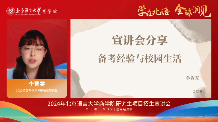 2023级国际商务专硕在读研究生李菁雯同学作为新入学的新生从备考经验与校园生活两个方面向大家介绍了她的经验。备考经验方面,她就知识密度大导致的遗忘问题和考试科目多导致的学习时间分配问题作了详细说明;校园生活方面,她分享了自己在北语就餐、学习、运动时拍摄的诸多美好照片,期待与大家来年相约北语,共创美好。