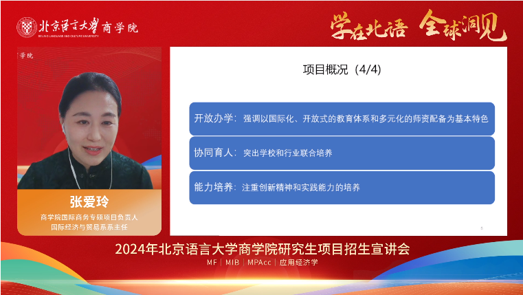 商学院国际商务专硕项目负责人、国际经济与贸易系系主任张爱玲教授从项目概况、项目特色、课程设置、实践教学、奖助体系、考试准备等六大方面对国际商务硕士专业作详细介绍。她提到,国际商务硕士项目强化双语教学与中外融通,发挥学校多学科办学优势和学院路共同体区位优势,注重学科交叉、产教融合和实践教学,致力于培养外语好、专业精、懂技术的国际化、复合型、应用型高级国际商务专业人才。2024年,北语商学院将继续招收全日制国际商务硕士专业学位研究生,包括国际贸易、跨境投资、数字商务三个培养方向。最后,张教授勉励广大考生珍惜MIB硕士项目前三年的招生红利期,积极报考北京语言大学商学院,早日顺利上岸。