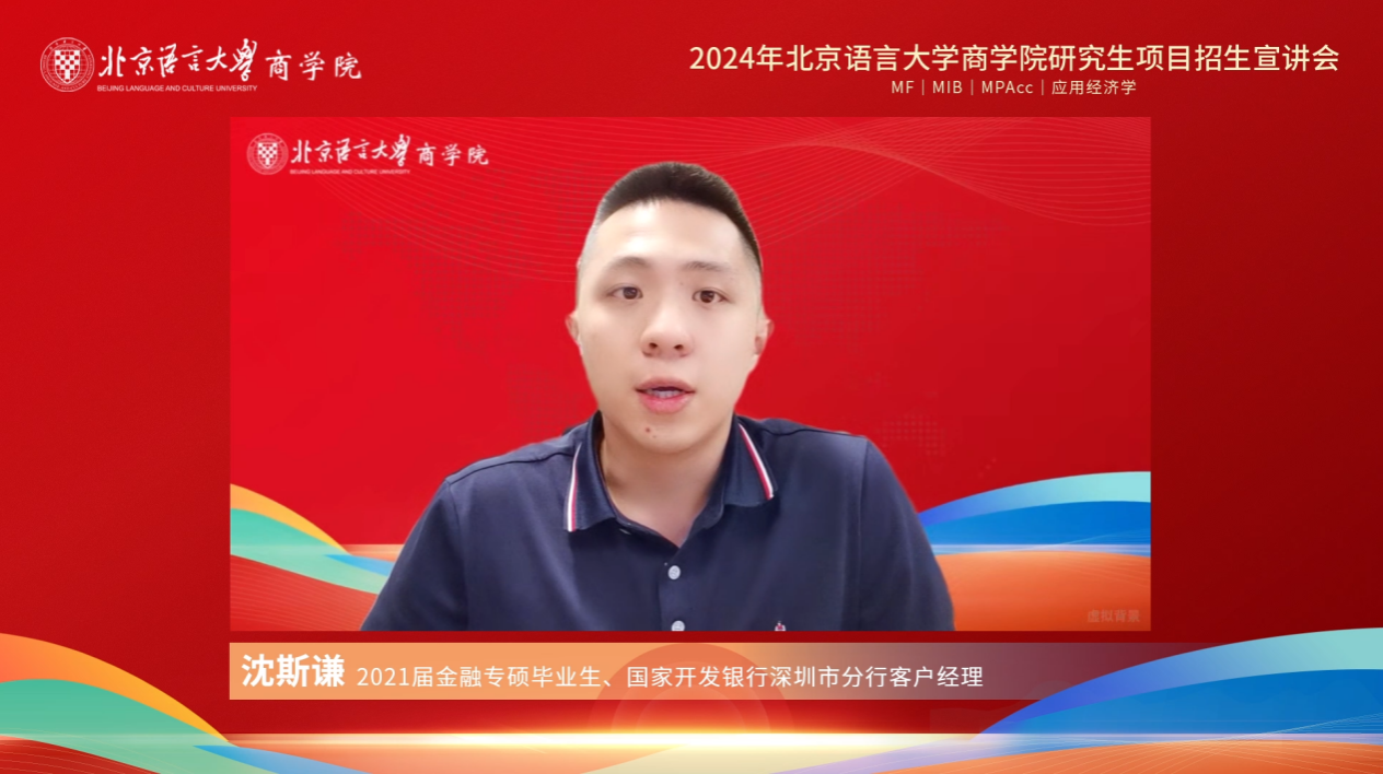 在优秀校友和在校生代表分享环节,商学院2021届金融专硕毕业生、国家开发银行深圳市分行客户经理沈斯谦校友首先发言,说明了他坚定选择北京语言大学的原因——地理区位、就读体验、课程设置及授课方式都给他留下了深刻的印象。他还分享了自己在职场的三点感悟:一要明确目标,二要注重理论与实践的结合,三要学好、用好计算机技能。最后,他祝广大考生顺利上岸,学业进步,祝北语商学院硕士项目越来越好。