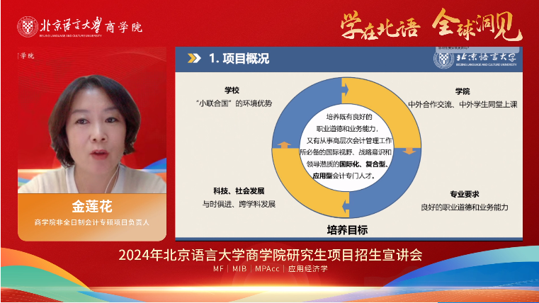 商学院非全日制会计专硕项目负责人金莲花教授对会计硕士专业作具体说明,内容涉及项目概况、课程设置、培养效果和其他报考注意事项。她谈到,北京语言大学商学院会计硕士(MPAcc)专业致力于培养既有良好的职业道德和业务能力,又有从事高层次会计管理工作所必备的国际视野、战略意识和领导潜质的国际化、复合型、应用型会计专门人才。2024年,商学院招收全日制和非全日制会计硕士研究生,根据市场需求和本校办学特色,本专业下设有会计与金融和会计信息化两个模块(方向),采用理论和实践相结合的培养方式,历年就业率和质量颇高。