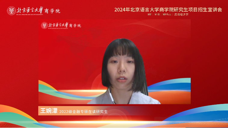2022级金融专硕在读研究生王婉濛同学表示她已经在北语度过了6个春秋,她结合自己在北语学习生活的经历,向大家介绍了自己的学习与科研方向。北语老师的温柔耐心、谆谆教诲让她从本科生向研究生身份的转变有了一个完美的过渡。最后,她还特别介绍了北语作为“小联合国”的丰富多彩的课余生活。