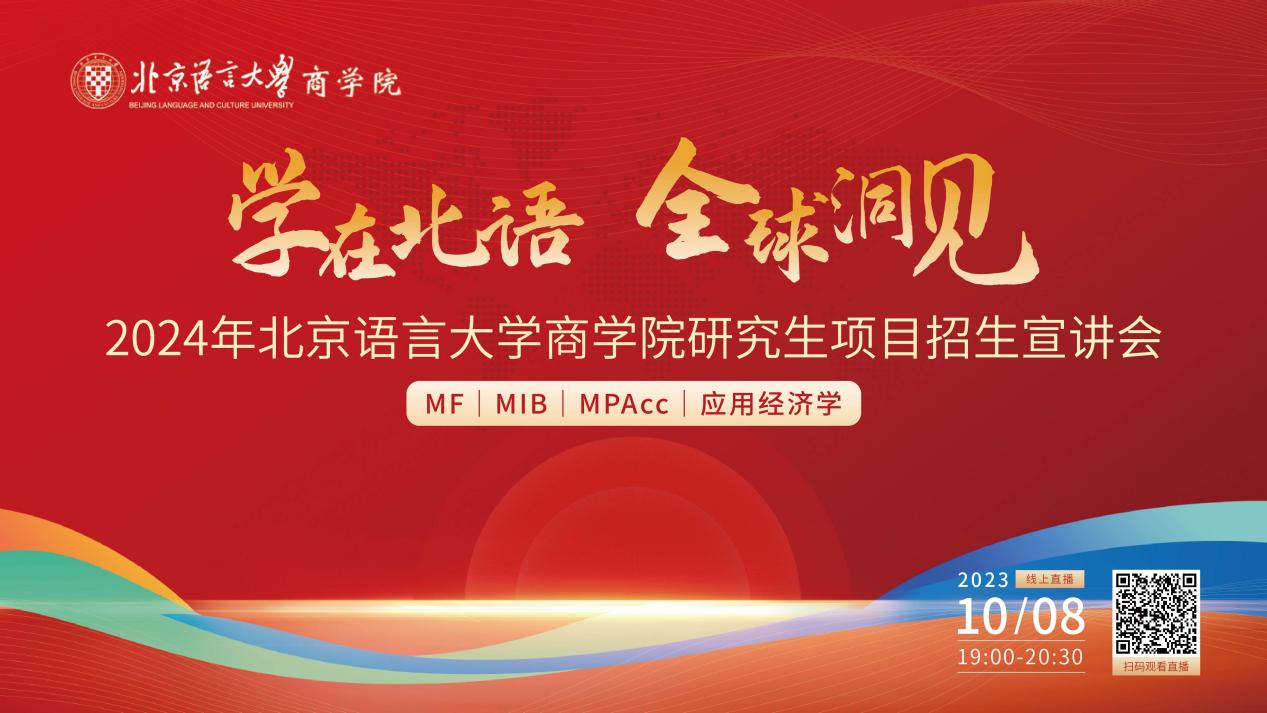 学在北语,全球洞见。10月8日晚19时,在全国联考网报的关键时期,为帮助考生及时、全面了解北京语言大学MF、MIB、MPAcc、应用经济学项目招生信息,解答网报疑惑,2024年北京语言大学商学院研究生项目招生宣讲会于云端成功举行。本次宣讲会特邀商学院各项目负责人,优秀校友和在校生代表出席,带大家领略北语商学院四大研究生项目魅力。中国MBA教育网提供全媒体技术支持。