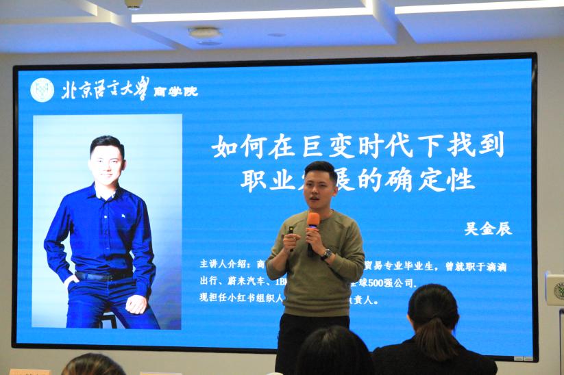 为帮助同学们更好地了解就业形势,明确职业发展方向,12月11日晚,北京语言大学商学院“CDG·职谈”第三期在图书馆日新讲堂举办。商学院党委副书记王慧媛、学办负责人刘珊、辅导员辛茹雯参加了此次讲座。主讲嘉宾吴金辰校友为商学院2011届国际经济与贸易专业毕业生,现任小红书组织人事部人才发展负责人。