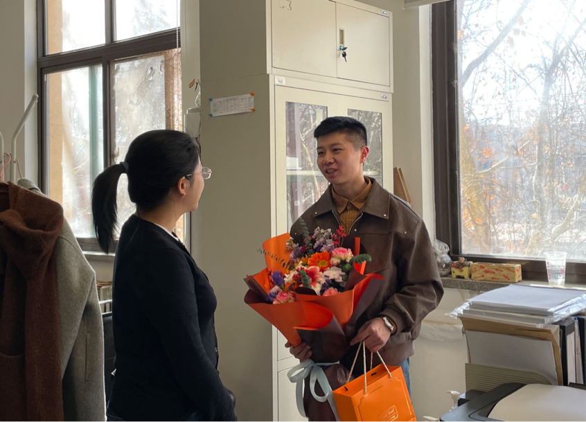 两位同学到校后,老师们与其亲切沟通,细心询问他们平日训练情况和如今返校感受。陈卓同学表示,两年军旅生涯锻炼了他的体能、磨砺了他的意志,培养出“特别能吃苦、特别能战斗、特别能奉献”的精神;回到校园后,他会继续保持优良作风,以饱满的精神状态投入到校园的学习生活中。黎永康同学对军旅生活感受颇深,他深刻体会到使命与担当的重要性,身处边疆大地,更加坚定了他保家卫国、坚守奉献的决心;在未来生活中,他也将永葆初心,带着军营的记忆继续前行。随后,各位老师向退伍学子送上礼物,真挚希望他们在今后亦能铭记军人精神、赓续优良传统,在日常生活中发挥模范引领作用,与同学们团结互助、共同进步。