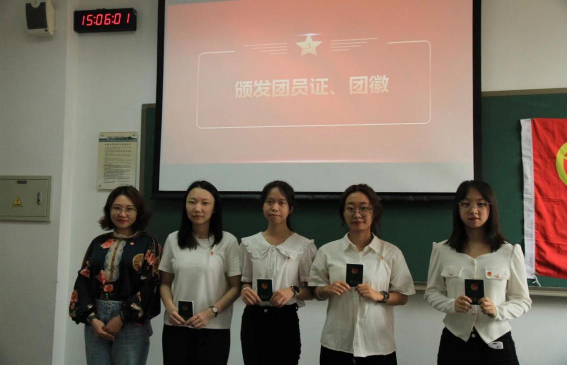入团仪式在雄壮的国歌声中拉开帷幕。在宣读了新团员的名单后,孙祎阳老师为新成员佩戴了团徽,颁发了团员证。