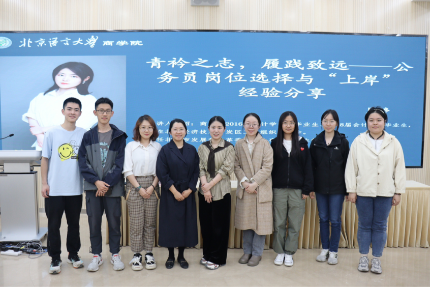 在校期间,周婷曾在普华永道、安永华明会计师事务所审计部门以及德勤咨询公司实习,毕业后以笔面试综合第一名成绩考录北京经济技术开发区管委会投资促进局公务员,曾在北京经济技术开发区工委组织部工作。此次讲座,她以“青衿之志,履践致远——公务员岗位选择与‘上岸’经验分享”为主题,根据自身考公的经历和体会,和同学们分享了公务员单位类型、公务员职业发展前景、如何选择公务员岗位等方面的内容。周婷提醒有意向报考公务员的同学们,要了解公务员考试的相关规定,及时关注招聘信息及政策变化,不要错过重要时间节点。对于如何选择公务员岗位,她结合自身经历,建议同学们可以根据个人兴趣与特长、学历要求与专业背景、工作地点与环境条件、薪资待遇与福利保障等方面选择适合自己的岗位,同时也要了解自身优势和不足,提高综合素质和应试能力。